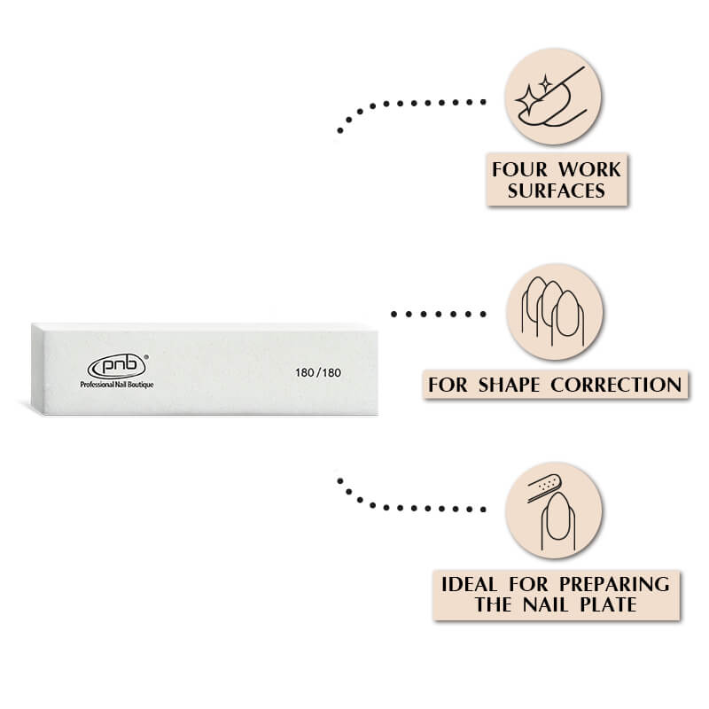 Profesionalus nagų blokelis turi keturis darbinius paviršius su 180 gritų abrazyvumu, klasikinės stačiakampės formos. Naudojamas nagų paruošimui atliekant gelinio lako manikiūrą, taip pat gelinių ir akrilinių nagų priauginimą.