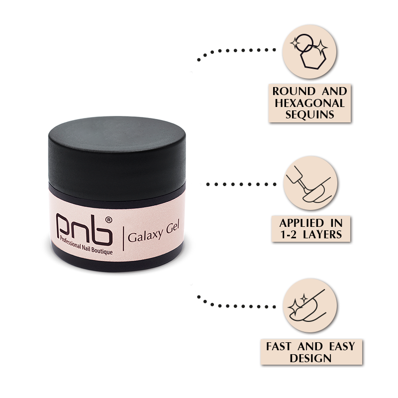 Tepkite gelį bet kuriuo jums patogiu šepetėliu ant paruoštos nago plokštelės 1–2 plonais sluoksniais, priklausomai nuo norimo rezultato. Šventinį, ryškų ir labai greitą dizainą galima sukurti naudojant Galaxy Gel, dengiant visą nagą arba jo dalį.