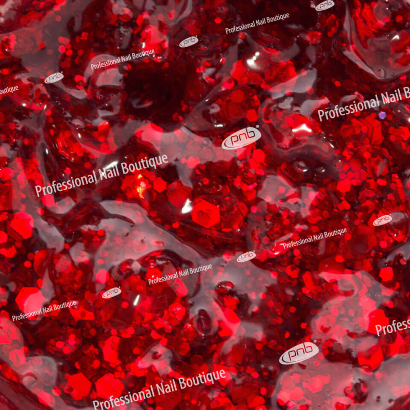 Tirštas skaidrus gelis, gausiai prisotintas įvairių formų ir dydžių blizgučių. Apvalūs ir šešiakampiai blizgučiai sukuria išraiškingą, tūrinį ir itin ryškų efektą ant nagų, žėrintį nuo skaisčiai raudonų iki tamsiai raudonų atspalvių.