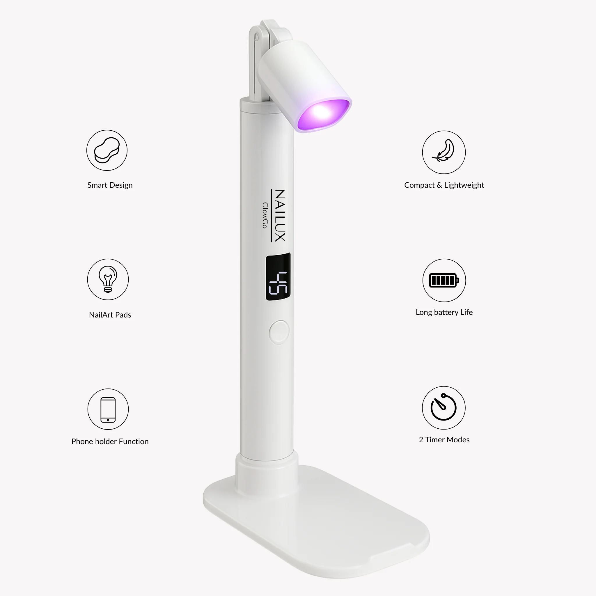 NAILUX GlowGo – tai kompaktiška, profesionali mini LED lempa, specialiai sukurta lanksčiam naudojimui studijoje arba kelionėse. Sveria vos 40 g, turi ištraukiamą lempą (16–19 cm), lengvai telpa į bet kurį krepšį ir paruošta naudoti iškart – puikus pasirinkimas mobiliems nagų meistrams, mokymų aplinkose ar spontaniškam darbui.