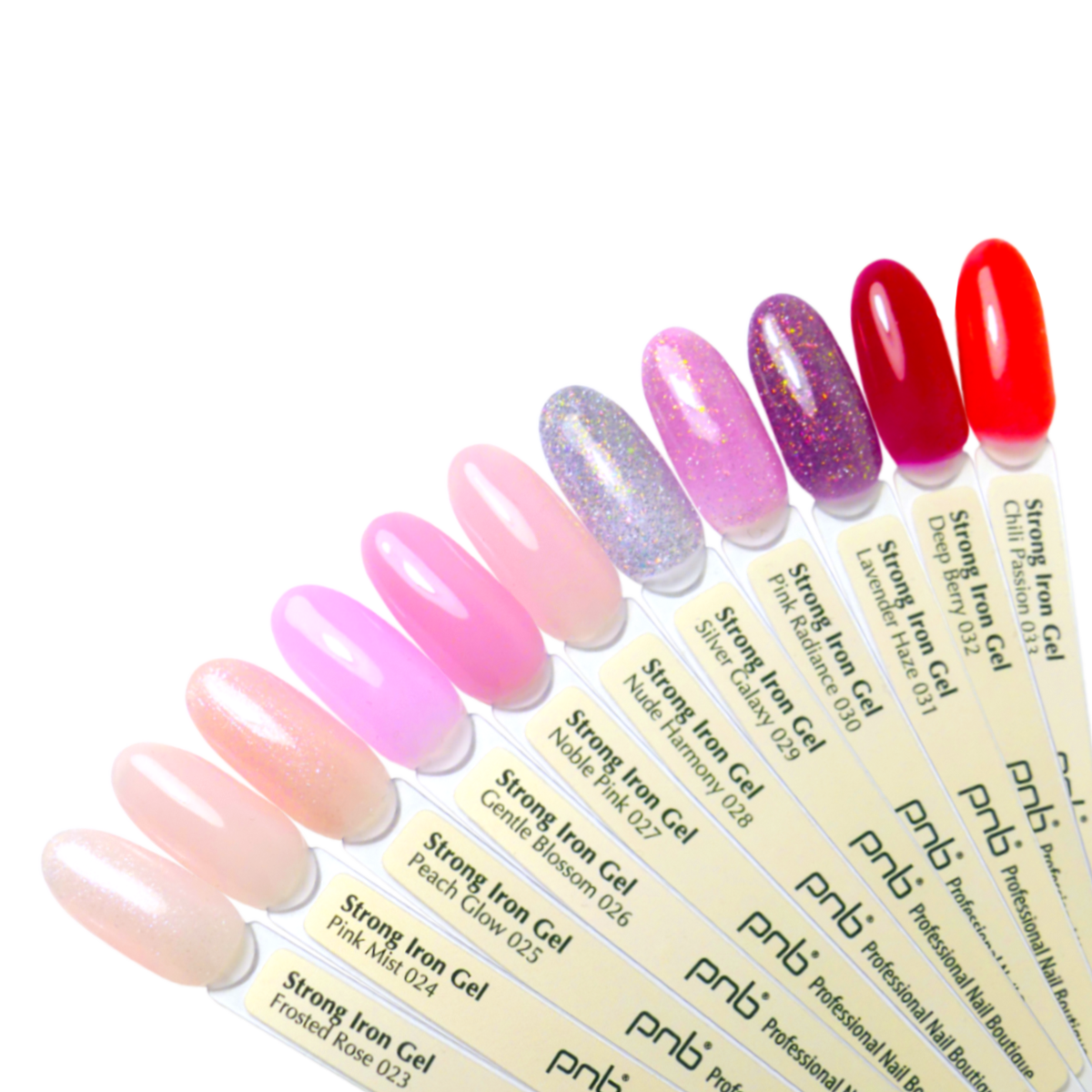 Jei reikia, uždėkite formas. Užtepkite ploną UV/LED Strong Iron Gel PNB sluoksnį, nekietinant įlašinkite gelio lašelį į apex zoną ir paskirstykite per visą nagą.